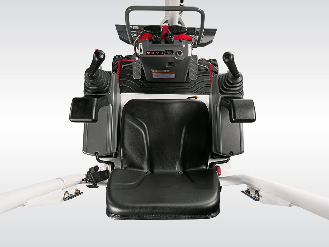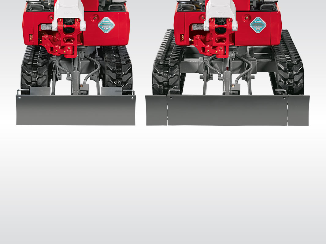Unser Kleinster ist aufgrund seiner Maße und Bauart besonders wendig und passt selbst durch sehr schmale Eingänge. Durch sein Teleskoplaufwerk und das extra-lange Planierschild ist er zudem geländegängig und sicher im Stand.